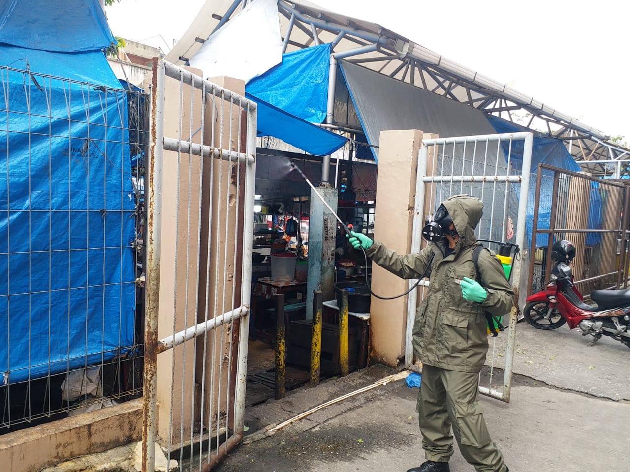 DPD Projo Riau bersama Tionghoa Peduli Covid-19 dibantu puluhan Satuan Korps Brimob Polda Riau melakukan penyemprotan disinfektan diseluruh kawasan Plaza The Central (PTC) Pasar Kodim Jalan Ahmad Yani Pekanbaru, Kamis.