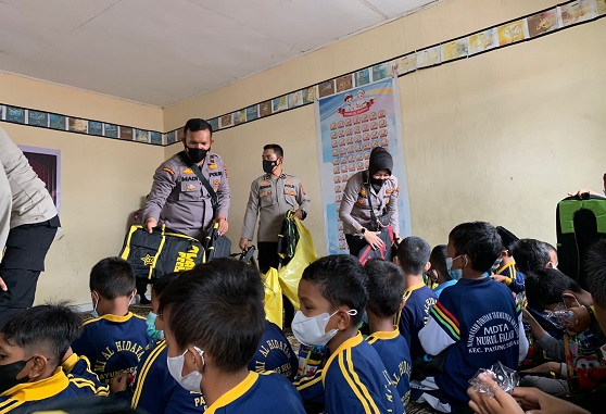 Seorang anak perempuan yang duduk di kelas 2 SD di Yayasan AL-Hidayah Pekanbaru, kegirangan saat mendapat tas baru dari Alumni Sekolah Inspektur.
