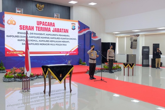 Kapolda Riau, Irjen Pol Agung Setya Imam Efendi memimpin Upacara Serah Terima Jabatan Pejabat Utama Polda Riau dan Kapolres jajaran di Aula Tribrata lantai 5 Mapolda.