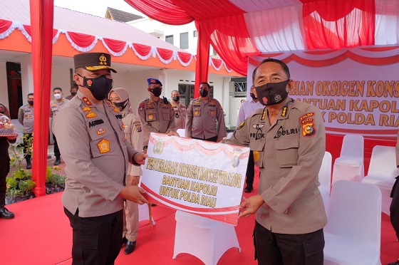 Kapolda Riau Irjen Agung Setia Imam Effendi menyerahkan 30 Oksigen Konsentrator kepada Kabid Dokkkes Polda Riau pada Senin.