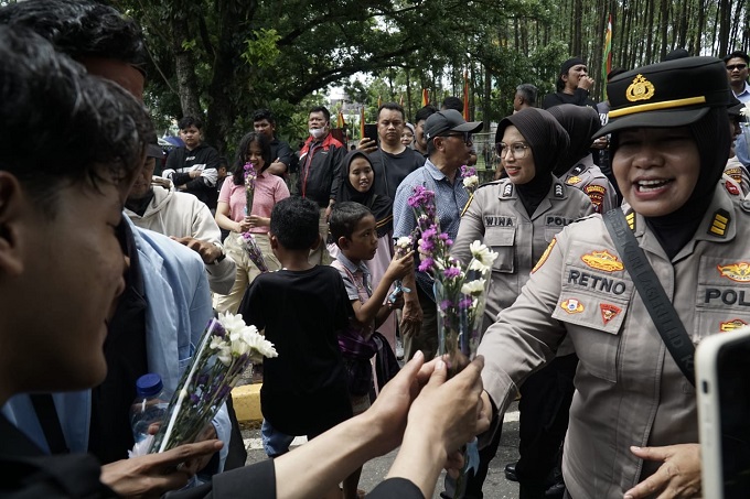 Momen unik terjadi pada peringatan Hari Jadi Polwan ke-77, Polwan Polda Riau menggelar aksi humanis dengan membagikan bunga kepada mahasiswa yang tengah.