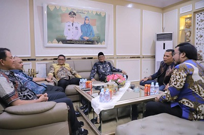 Penjabat (Pj) Walikota Pekanbaru Muflihun menerima kunjungan dari Walikota Padang beserta rombongan Forkopimda Padang di rumah dinas Walikota Pekanbaru.