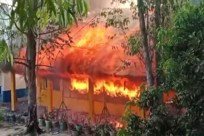 Gedung kesenian SMP Bernas Pangkalan Kerinci di Pangkalan Kerinci hangus, Kabupaten Pelalawan.